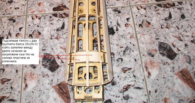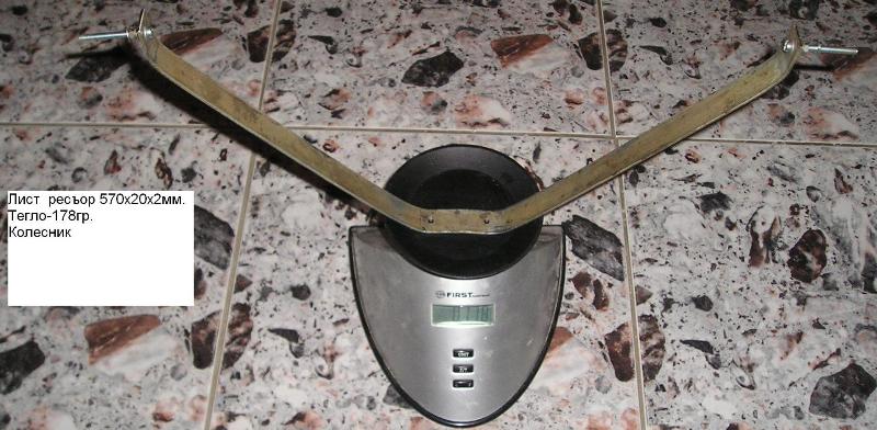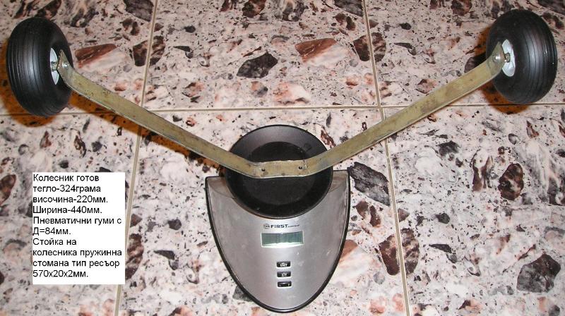 Днес си играх да правя колесник.Първо подсилих тялото там където трябва да се захване колесника.Случайно намерих подходящ лист ресъор некъв вид торсион е бил от лека кола може би с размери 570х20х2мм който изглежда, а и върши идеална работа за амортизация, а и най вече изглежда като истински за това СУ. Лошото се оказа теглото му което е цели 178грама и е равно на теглото на цялото тяло.След като видях теглото щях да скоча от терасата от яд ама минало бешело бях си играл с него да го огъвам и пробивам затова реших да довърша колесника с него, а дали ще лети ще преценя по-натам. След това сложих хубавите и красиви купешки пневматични гуми с диаметър 84мм на кантара и пак щях да получа сърдечен удар, инсулт сърцебиене и дюстабан от видяното-тегло 144 грама на двете гуми. Общо тегло на колесника с гумите дойде 324грама и изобщо не ми харесва.Въпреки огромното тегло все пак го сложих на тялото за да видя как ще изглежда. За визията си я има, изглежда добре, даже прекрасно, но с това тегло много ме съмнява че ще остане на този самолет.Когато дойде време за облитане ще преценя дали да оставя този колесник, или да правя друг.По принцип колесника е нужен само при кацане когато се излита от ръка и през цялото друго време е напълно излишен като хем тежи, хем прави и челно съпротивление по време на полет. Тъи като съм правил прекалено леки самолети който във въздуха се държат като лек планер, и най малкия полъх на вятъра ги е отклонявал от праволинейно летене реших да оставя този колесник докато направя готов самолет и измеря реалното му натоварване на площ, ако е около 50-70 ще остане този колесник, ако е над 80-90 няма да го бъде с този самолет и чак тогава ще правя друг колесник ако има нужда. Ето и фотоотчета: