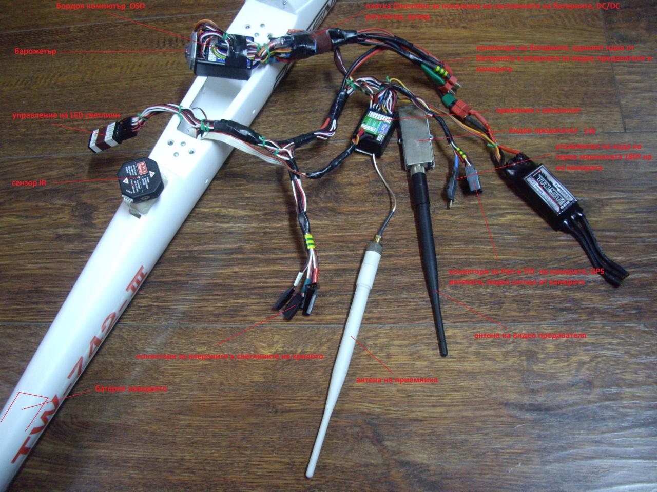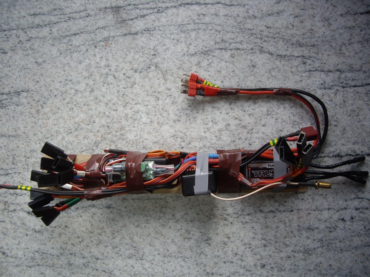 След това свързах всичко по схемата и оставих конекторите готови за включване към съответните места. Над спийд контролера изведок кабелите отиващи към кабината(за двете серва на камерата, за видео камеерата и GPS антената) и кабелите за батериите. Назад отвадох удължител за включване на батерията за видеото, която се намира отзад в опашката, конекторите за задните сервомашинки на опашката, конекторите за стабилизиращата система и конектотите за задните светодиоди. На горе събрах в друг сноп конекторите за крилото(алерони и светододи на краищата на крилете). Накрая се получи един доста прибран пакет: