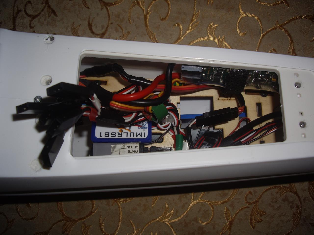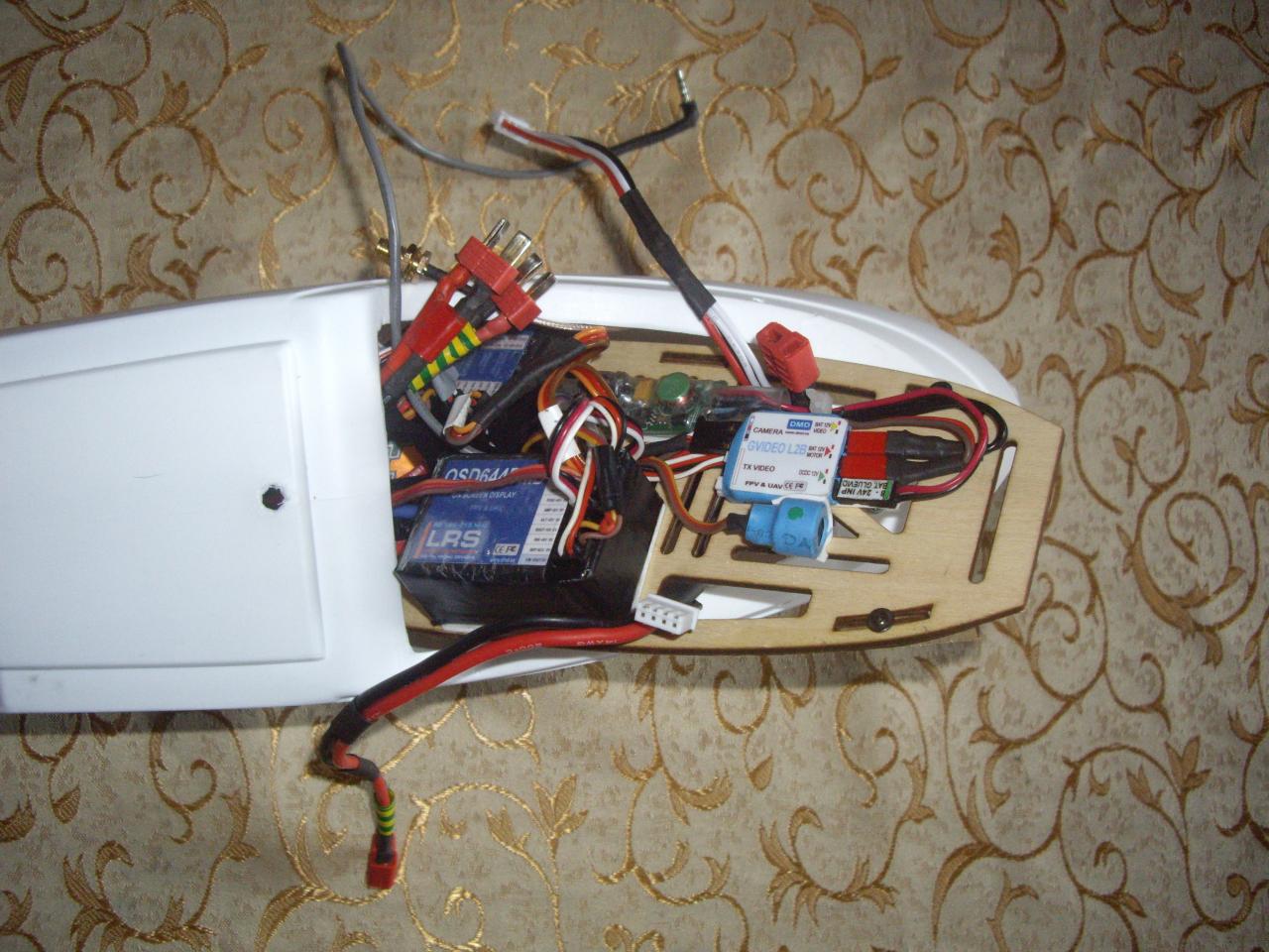 Поставих батерията на видеото и главната батерия на дъното на фюзелажа без да ги фиксирам за сега, за да мога след окомплектоване на целият самолет лесно да променя положението им и с това да докарам центъра на тежестта и чак тогава ще ги фиксирам. След това внимателно без усилия вкарах електрониката и закрепих платформите от шперплат с видичките.