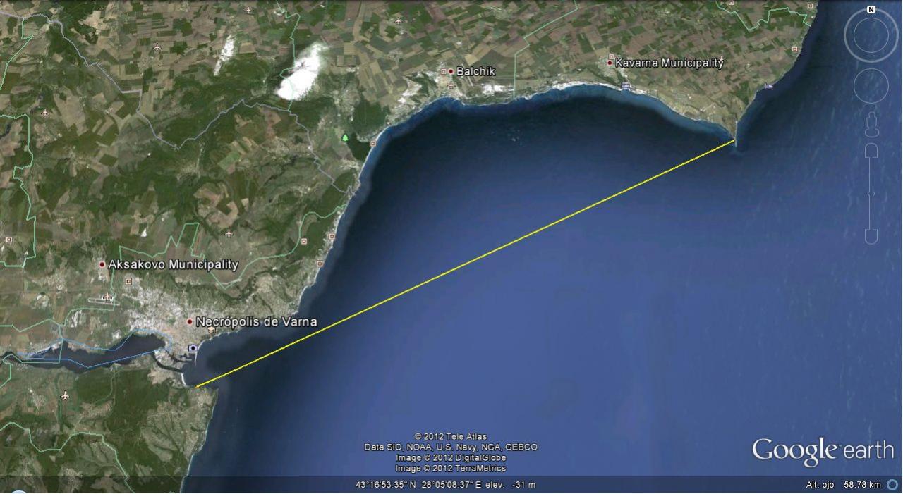 Пробата я направихме с един мой приятел, на когото оставих елементите, които са част от електрониката на самолета, наредени на една летвичка от щперплат за пробата и го оставих на предварително избрано място в кв. Галата на Варна с чудесен изглед към града и към нос Калиакра. А аз с наземната екипировка се отправих към нос Калиакра от където щях да направя теста. Разтоянието по права линия е почти 50 км. без никакви препядствия между предавател и приемник.