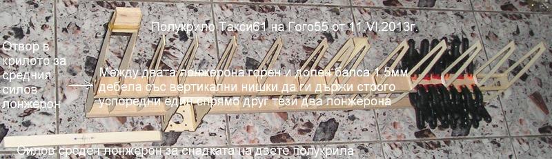 Кръщавам модела ТАКСИ 61 защото е в размера за двигател .61 /10кубиков/ около 1,8м. разпереност. Модела го предвиждам предимно за релакс, или снимки, и видеозаснемане от въздуха-затова името му е ТАКСИ. За да бъде максимално стабилен и да лети сам значи трябва да е горноплощник със носещ сигурен и изтестван профил. Ще го направя с два двигателя на крилото ASP21, или ASP32, та чак до ASP52 според теглото му, като ще гоня тяга малко повече от общото полетно тегло което ще се получи. Трябва да дойде под, или около 3кг. по принцип общо полетно тегло този модел. Предвиждам на око горе доле да е около 1кг. гол самолет, 1кг. двг и електроника, и 1кг. полезен товар. Също така предвиждам някога ако ми скимне да го направя с един двигател отпред в носа 10 кубиков метанол, или 20-30 кубиков бензин. За целта просто ще сменя първото ребро от тялото с подходяща моторама на него. За да икономисъм някои грам /поне стотина грама/ ще бъде с основен колесник малко пред крилото с голями гуми даметър поне 80мм. до 120мм. за да нямам грижи при неокосена трева, и със заден малък колесник на опашката. Направата на модела трябва да е максимално бърза, ефтина и лесна, както и евентуални ремонти в бъдеще неопределено време. За целта се спирам на правогълно по сечение тяло за лесно слепване без да има нужда от станоци и прочие изгъзици усложняващи ми живота, и губещи ми времето в лепки вместо в летене. Тялото ще е от няколко части за лесна подмяна само на една от тях при нужда след краш, или чупене. Материал основно тополов шперплат 3мм дебел и борови лонжерони, балса 1,5мм. само за обличане на първата една трета от крилото. Фолио червено и бяло, бялото отгоре, червеното от доло, както на всичките ми самолети. Лепило в минимално количество на хенкел както на всичките ми самолети. При силен удар трябва да се разлепва даден детайл, а не да се чупи близко до слепката! После ремонта ще е лесен и бърз! Та те това е горе долу началното задание което нахвърлях набързо за този модел.
