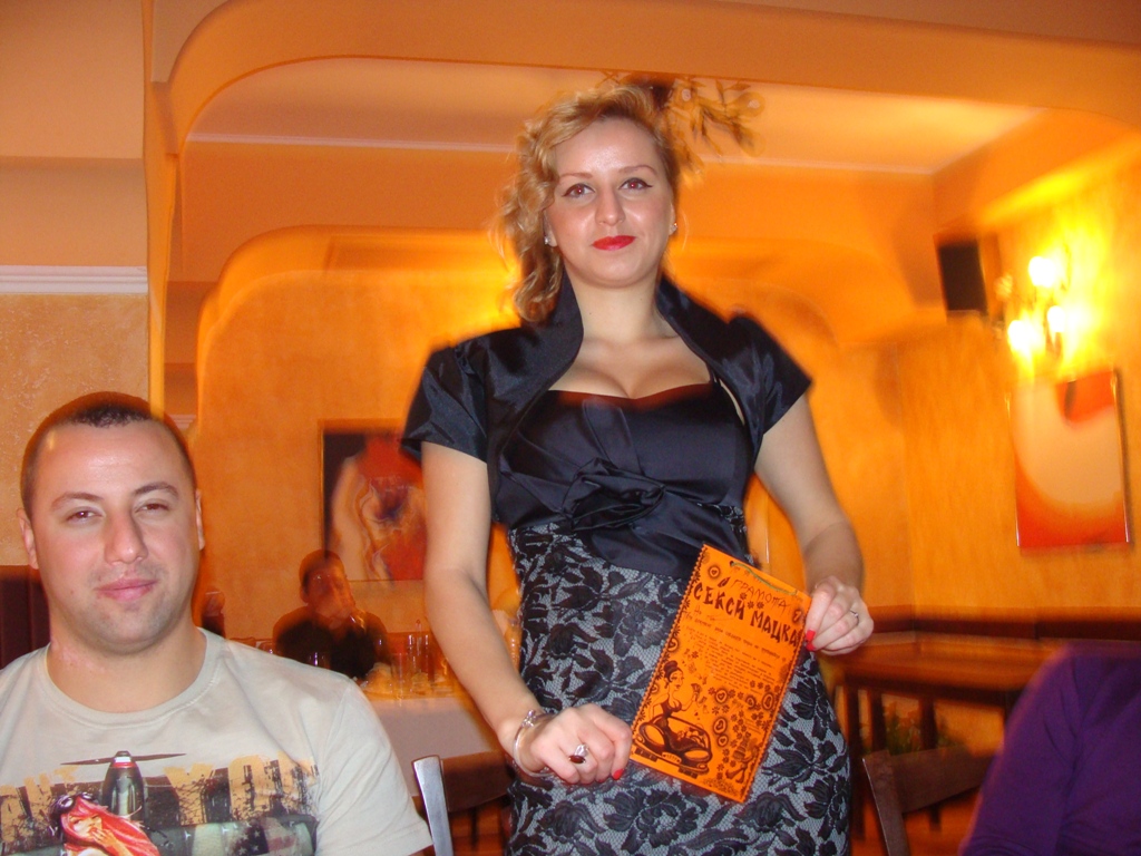 Най-интересното обаче беше един сертификат, който казва че ти си секси мацка и на тебе се полагат определени секс-привилегии. Ако щете вярвайте, но този сертификат го получи най-секси мацката на вечерта - приятелката на Николай Рашев. Много готина мадама. Очите на всички се изкривиха да я гледат в бюста. Та тази мадама спечели сертификата и Явор Йотов дори има честа да го връчи и да я прегърне през кръста за снимките.