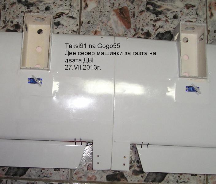 Монтирах и двете серво машинки за двата елерона. Реших поради липса на достатъчно канали в моята SANWA /8 канална/, да останат само елерони, без функцията флаперон. И тук както и на другите две серво машинки сложих по един ферит близко до самата машинка, и един ферит близко до буксата за включване към приемника. Теглото на тези ферити до сега отива сигурно около 50грама, но при този модел както се вижда не правя компромиси със здравината и сигурноста за сметка на теглото! Удължих кабелите на тези две серво машинки със по 60см. проводници със сечение 0,35кв.мм. Свързах двата кабела от двете серво машинки един към друг и към буксата /получих Y кабел/ чрез спойки със калаи за по сигурно! Тягите отново са спици от колело с резба М2, а рогчетата от евтините от хоби кинга пластмасови и ябълковидно между рогче и тяга за да няма луфтове. И днес тези две серво машинки ми отнеха около 2 часа без да бързам, спокойно и с мерак ги монтирах. Резултата е на снимката по долу.