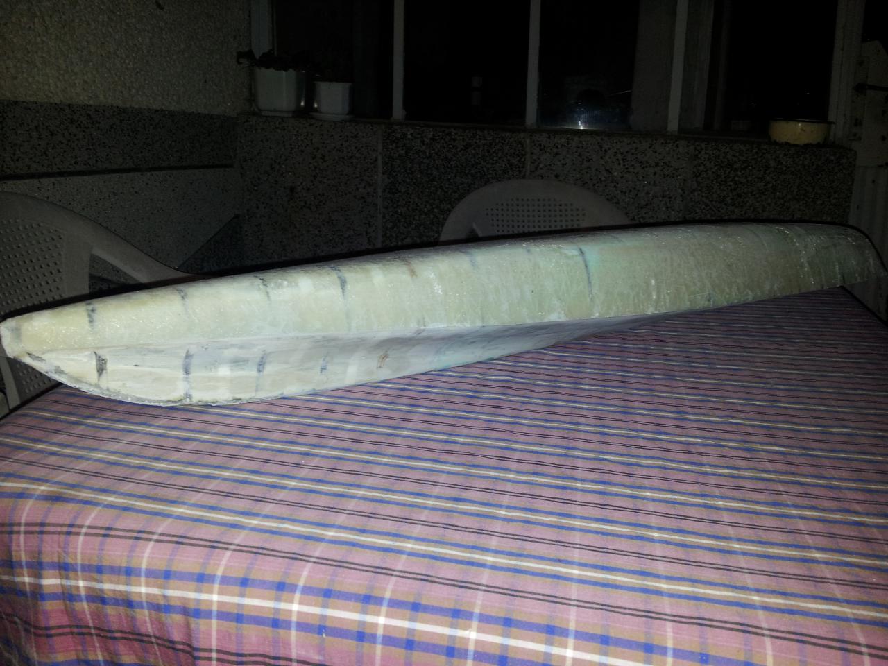 Горе-долу там, където свършват надлъжните ребра на дъното се виждат малки участъци, главно по кила и ръбовете до бордовете, където смолата още не беше пропила добре и не бях изгонил въздуха докрай. Нарочно снимах преди да довърша - за илюстрация, в последствие всички такива слаби места бяха оправени. Върху готовата ламинация сложих пласт PE домакинско стреч фолио и с валяче прокарах още веднъж плата отгоре. След това насипах върху фолиото сух гипс и го затъпках в опит да спра оттичатето на смолата по по-стръмните участъци. След първоначалното стягане махнах гипса и фолиото и сложих модела на слънце за 6-7 часа, за да се загрее качествено и да се получи пост-полимеризацията както трябва. Резултатът е просто кефещ. Много ме беше страх да не си съсипя труда от последните седмици с тази процедура, но добрата смола и добрия плат направиха процедурата лесна и съвсем безпроблемна.