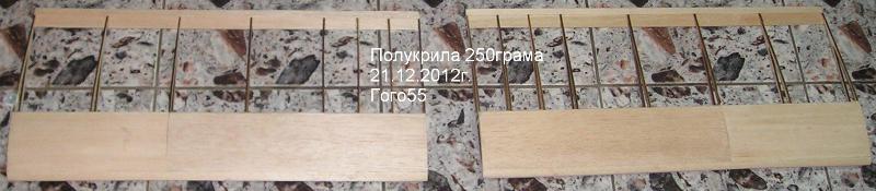 След кабината идва ред на крилото. Профила е Е-205 с дебелина от 10,48% и хорда от 350мм. Изработката е по класическата технология от време оно, нервюри от шперплат 3мм., лонжерони от бор, и атакуващ и изходящ ръб от балса.То ще бъде от три части, центроплан 120см., и две полукрила по 60см. всяко, като цялото крило идва с обща разпереност от 240см. Полукрилата ще се закрепват към центроплана със силов лонжерон под ъгъл от 3 до 7 градуса, или без ъгъл така че да може да се получи и нацяло право крило , както и крило тип \________/ според настроението ми, и това което искам като напречна стабилност от модела. Изработката е видна от снимките.