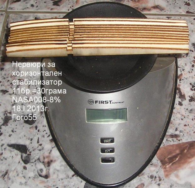 Следващата стъпка по направата на този модел е хоризонталния стабилизатор. Реших да го правя по класическата технология за крило поради голямата му разпереност от 80см.. Избрах си профил NASA008 с 8% дебелина. Начертах и резнах на лазера, после слепки за 5 мин. и е полуготов. Ще го довърша нацяло някоя друга вечер.