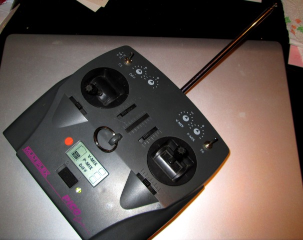 Мултиплекс 4 канала 40 мХц. Предавател и приемник, работят отлично, обхватът е повече, отколкото мога да видя модела. Има дуал рейт на елерони и елеватор.