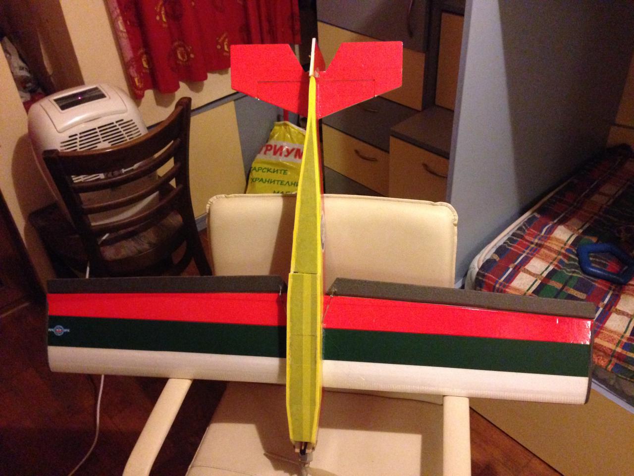 2. На второ място депронов акробат, напълно оборудван с чисто нова батерия на 2 цикъла. Перфектен както за акробатични изпълнения, така и за начинаещи, заради леката си V-образност на крилата. Моторът има тяга да го тегли вертикално нагоре без проблем. Ето и снимки на модела: ЦЕНА 150 ЛВ!
