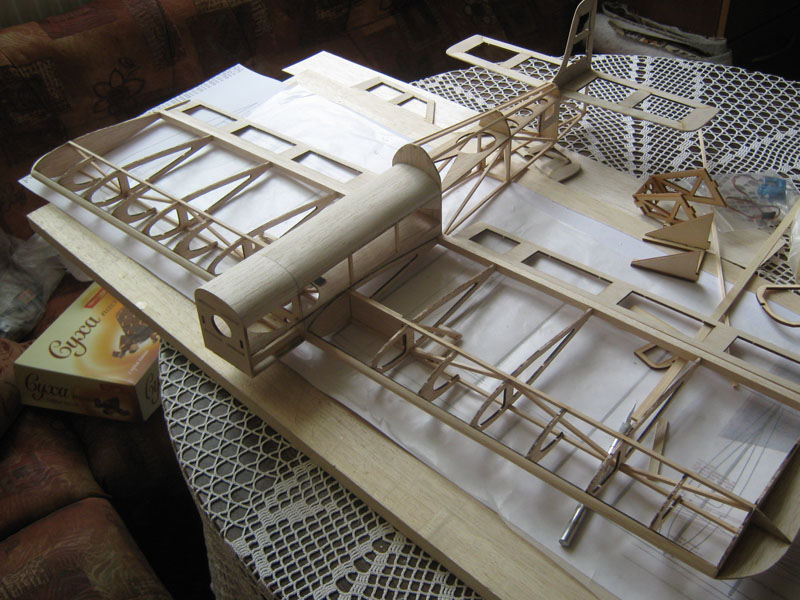 Започнах тялото. То се сглобява около централна пластина изрязана от 2мм балса. Ребрата се нареждат в указания ред и се залепват. Понеже долната страна на тялото е равна, единственото което трябва да се направи, е да се внимава всички ребра да допират монтажната дъска по време на целия процес на сглобяване на тялото. Единствения необходим инструмент (освен нож и лепило), е триъгълник за проверка на перпендикулярността на детаилите. Това което ми остана да довърша по тялото е да облека горната носова част с 1мм балса и да оформя носовата част. Общото тегло на всички детайли до момента е 46 гр. Ако и крилото е в тази теглова категория, очаквам целия модел без електрониката да е под 150 гр. Надявам се полетното тегло да е около 300-350 гр.